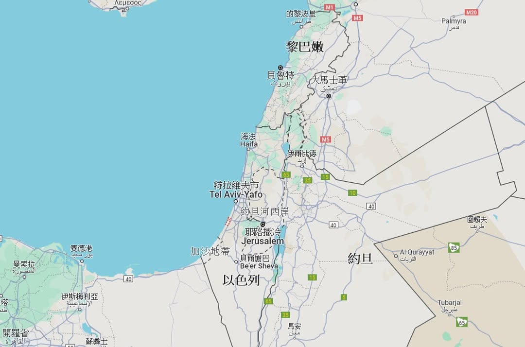 - 現在的以巴地區相對地理位置(圖二): 把以色列當作中心點,正中間是耶路撒冷(Jerusalem,圖三),耶路撒冷旁邊的藍色區域是死海,約旦河最後就是流入死海;耶露撒冷左邊就是非常大的城市-特拉維夫(Tel Aviv-Yafo,圖四),往上走也是非常大的海邊城市-海法(Haifa,圖五),而如果往下走就會到達加薩,AKA露天監獄。把目光放大一點,以色列下方就會直通埃及,右邊是約旦,北邊是黎巴嫩和敘利亞