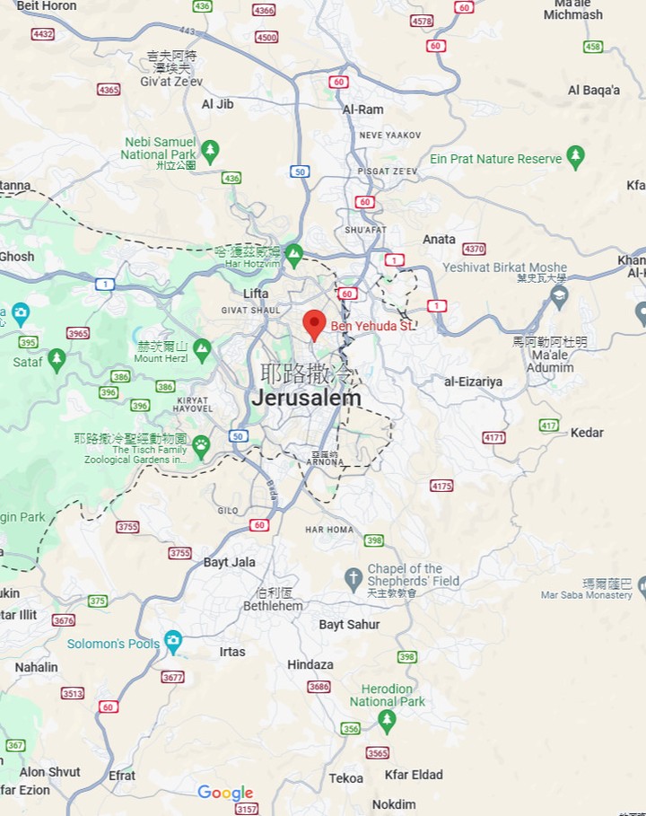 - 1997/09/04 - 聖城耶路撒冷遭受恐怖攻擊4,這起攻擊由哈馬斯主導,三名自殺炸彈客在耶路撒冷的本耶胡達街(Ben Yehuda Street,圖五)上一座購物商場旁引爆炸彈,其中一名死者絲瑪黛•埃爾赫南(Smadar Elhanan)就是米科•貝雷德(Miko Peled)的姪女,年僅十三歲。而絲瑪黛的媽媽努莉•貝雷德(Nurit Peled-Elhanan)的童年朋友就是現任以色列總理班傑明•納坦雅胡(Benjamin Netanyahu,圖六),貝雷德家族是以色列建國非常重要的軍事功臣