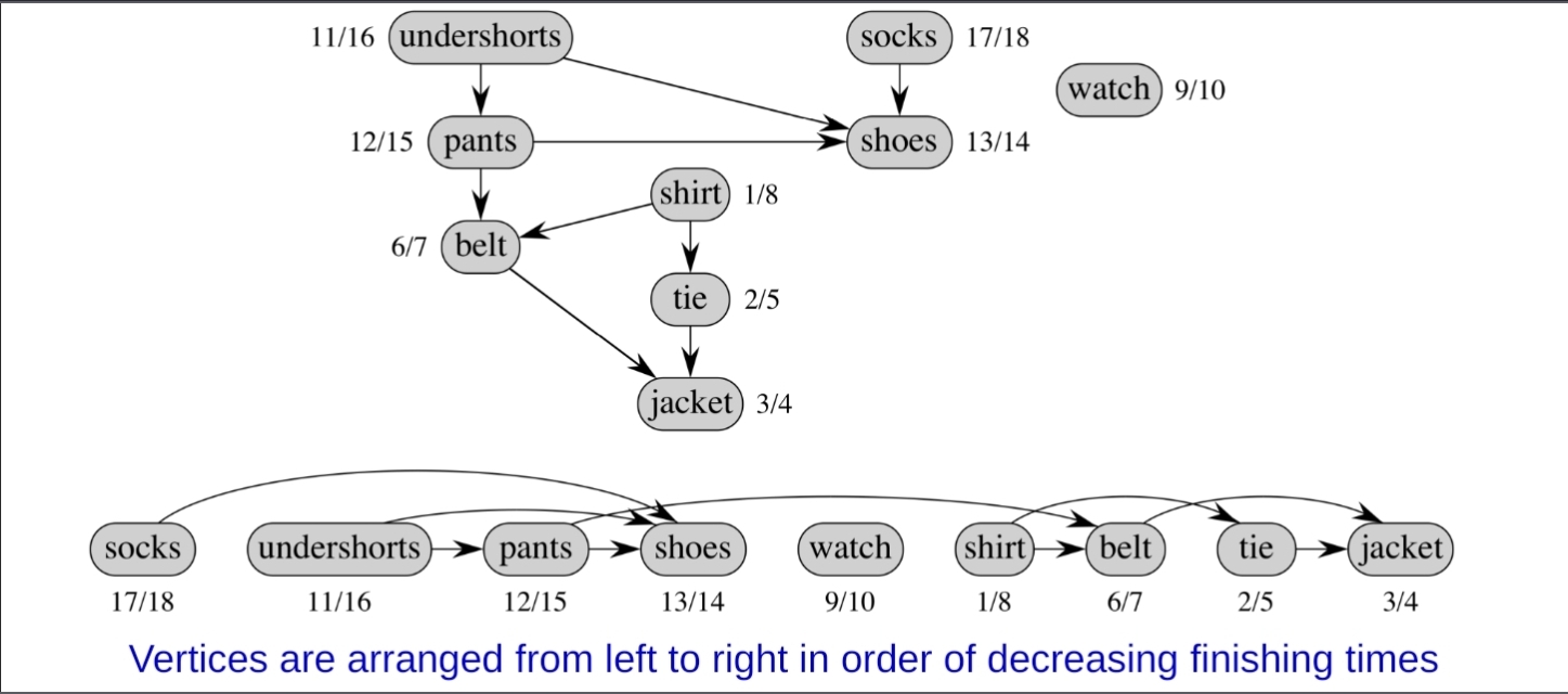 很簡單,是一種對有向無環圖(directed acyclic graph, DAG)的排序方式,把所有頂點排成一個線性順序,使得每一條邊$u\to v$,u 都排在 v 前面。👉 有「先後關係」的排序。