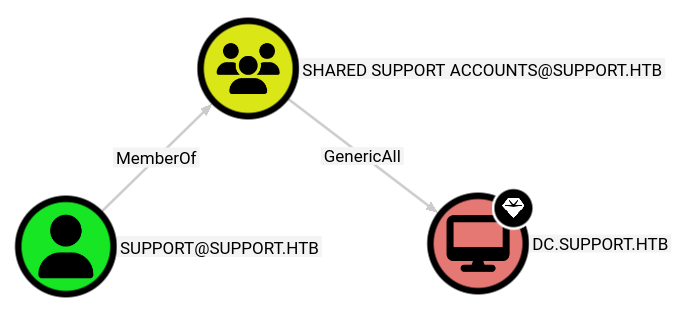 從上面的圖可以看得出來support是這個 group 成員,而這個 group 對 DC(電腦物件)有 GenericAll,也就是可以「完全控制 Domain Controller 的 computer object」