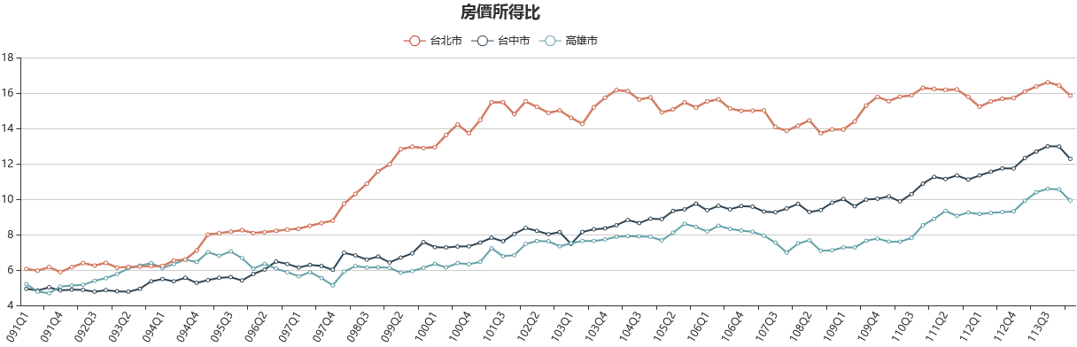 - 房價所得比1 = 中位數住宅價格 / 中位數家戶可支配所得 → 以2024年台中市為例,一般家庭要買一般的房子需要不吃不喝超過12年