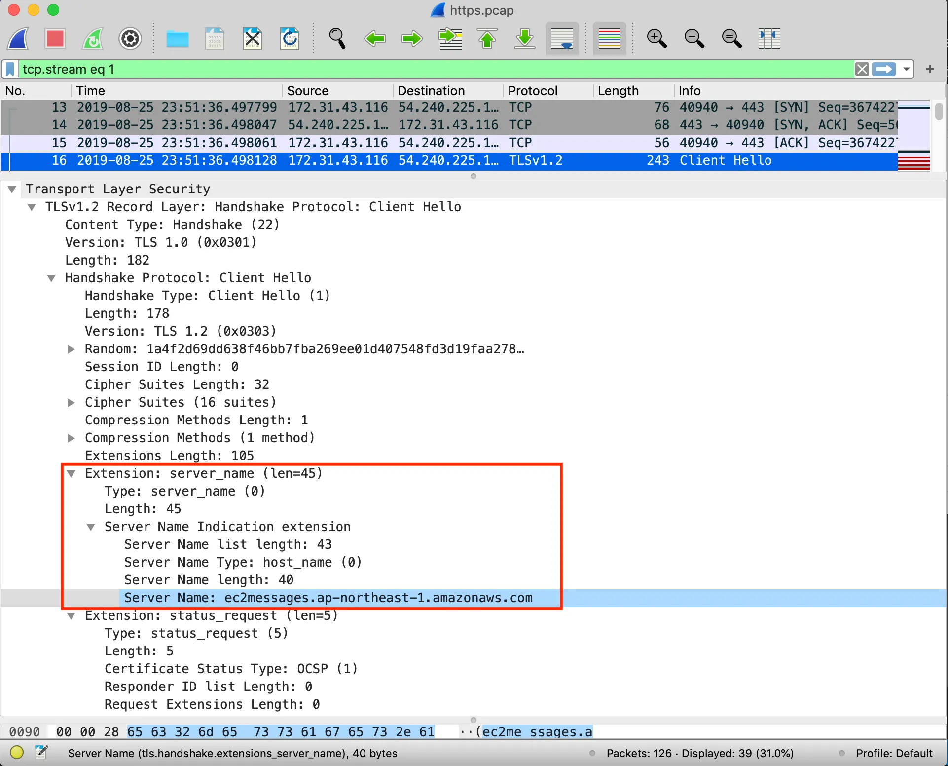 HTTPS 把這件事變得有點麻煩。在 TCP 連線建立完成後,接著進行的是 TLS handshake ,這時候 Server 會需要回應一張證書給 client 。如果今天一個網站有一張以上的證書,事情就變得很麻煩,我到底要給哪一張。這時候沒辦法看 Host header ,原因是 TLS 會發生在 HTTP headers 訊息傳送之前。除非你可以預知未來,不然無法偷看到 Host header 。因此 SNI 要解決的問題,就是 server 不知道要給哪一張 certificate 的問題。SNI extensionSNI 是在 TLS handshake 的 client hello 規格部分加一個額外的欄位,裡面放的是 client 想訪問的域名。如此一來 server 就知道要回應哪一張證書了。